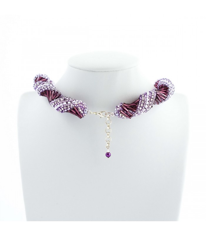 Elegantní náhrdelník ve fialovostříbrné barvě šitý do tvaru spirály.